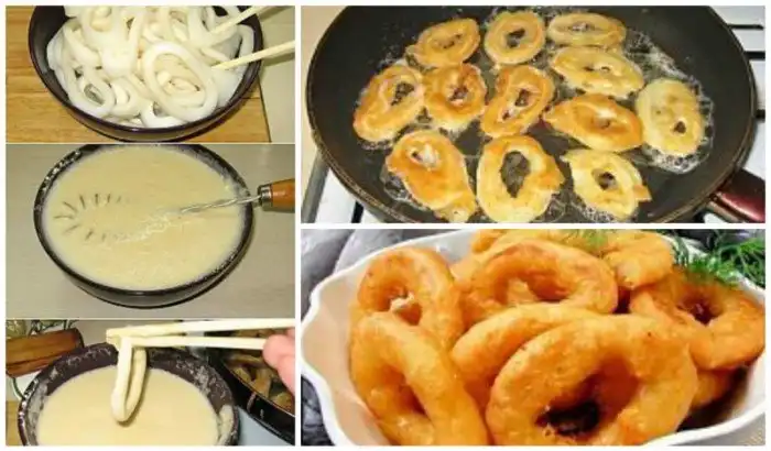 Кальмары в кляре - нарезать кружочки, макнуть в кляр, обжарить в масле. Два совета - кальмары не варить - обдать кипятком, кляр делать на пиве - 100 грамм пива, 2 яйца, мука до состояния чуть гуще чем, как на оладьи.