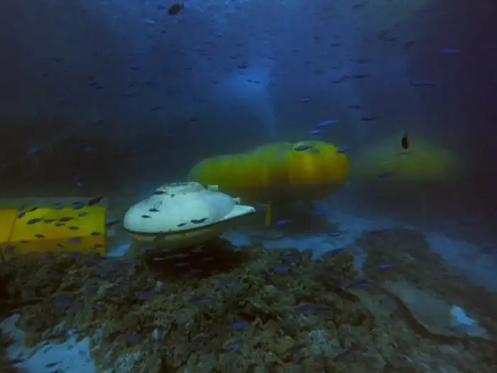 Кроме «Морской звезды» здесь же располагался воздушный ангар для «ныряющего блюдца» — подводной лодки, которой пользовалась команда Кусто. Проснувшись с утра на глубине 10 метров под уровнем моря, можно было выпить кофе, отправиться в путешествие на глубину 300 метров, открыть с десяток неизвестных видов животных, а уже к обеду вернуться, чтобы поесть бутерброды с тунцом и рассказать о своих приключениях товарищам. И все это не покидая океана! Для 60-х годов такие истории звучали как фантастика на грани безумия.