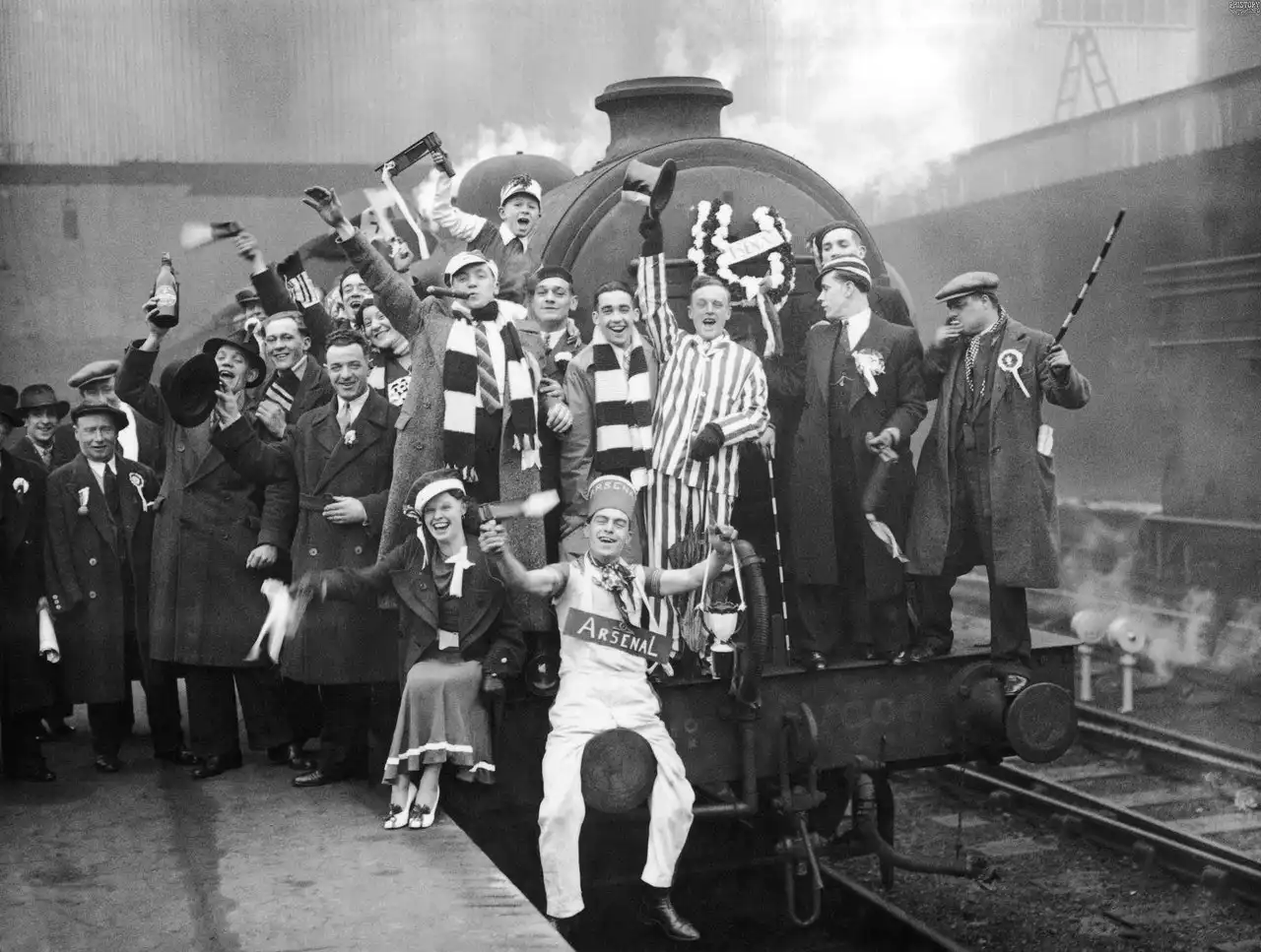 Болельщики футбольной команды «Арсенал» на железнодорожном вокзале Кингс-Кросс перед отправкой в Хаддерсфилд, где происходил матч полуфинала Кубка Англии между командами «Арсенал» и «Гримсби Таун». Лондон. Великобритания. 1936 год.