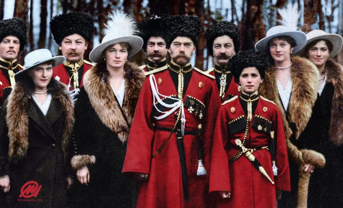 Анастасия, Ольга, Николай Второй, Алексей Николаевич, Татьяна, Мария и кубанские казаки, 1916 год.