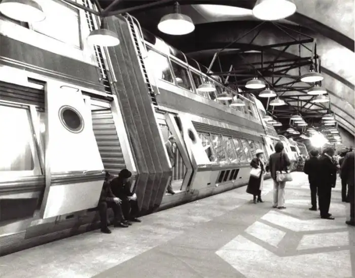 Для его съемок создали концепт поезда будущего и несколько его макетов, один из которых был в натуральную величину (на фотографии) — над его экстерьерами и интерьерами работали лучшие дизайнеры того времени. Однако этот сериал провалился, а атомные поезда с двухэтажными вагонами, ездящими по железным дорогам сверхширокой колеи так и не появились.