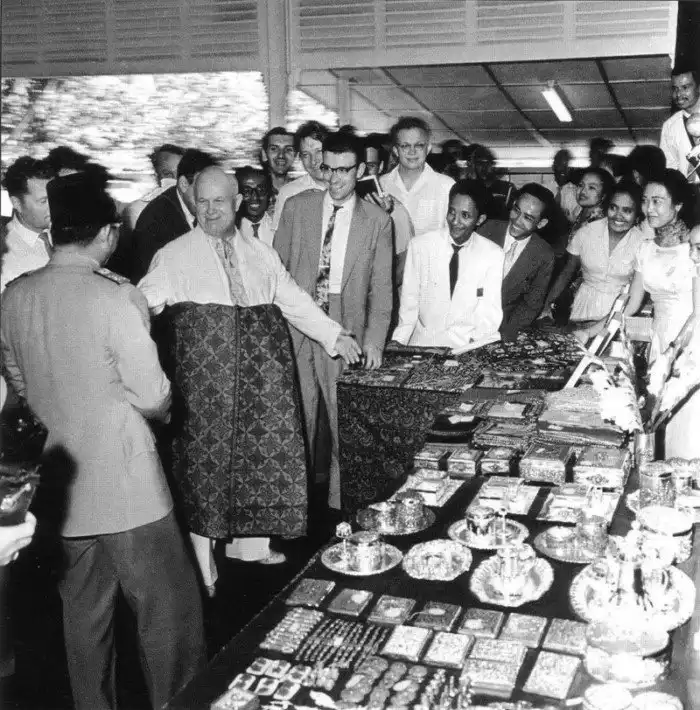 Президент Индонезии Сукарно и Н.С.Хрущев на выставке местных промыслов. остров Бали. Индонезия. 1960 г.
