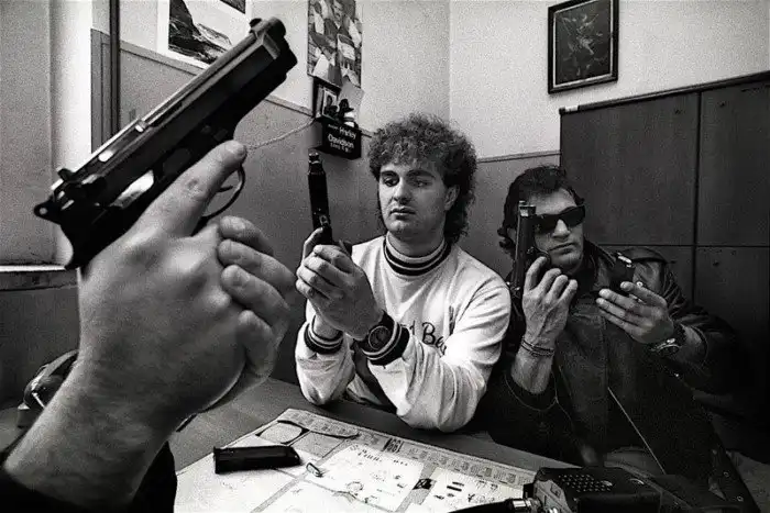 Опергруппа криминальной полиции Департамента общественной безопасности МВД Италии готовится к рейду. Неаполь, Италия, 1990 год.