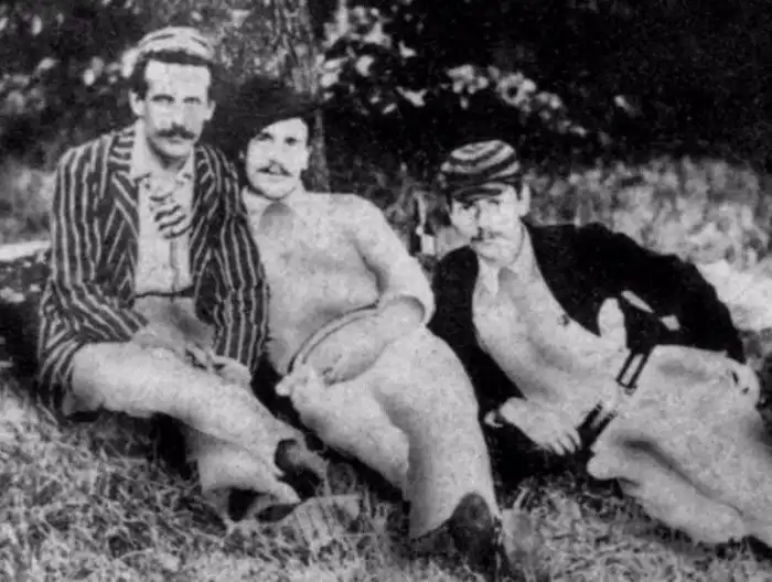 Реальные прототипы произведения Джерома К. Джерома, "Трое в лодке, не считая собаки". Действительно, у Джером К. Джерома было двое друзей, с которыми он неоднократно путешествовал на лодке по Темзе и ездил на велосипедах через Европу в Шварцвальд. Cлева направо — Карл Хенчель (Гаррис),Джордж Уингрейв (Джордж) и Джером К. Джером (Джей).