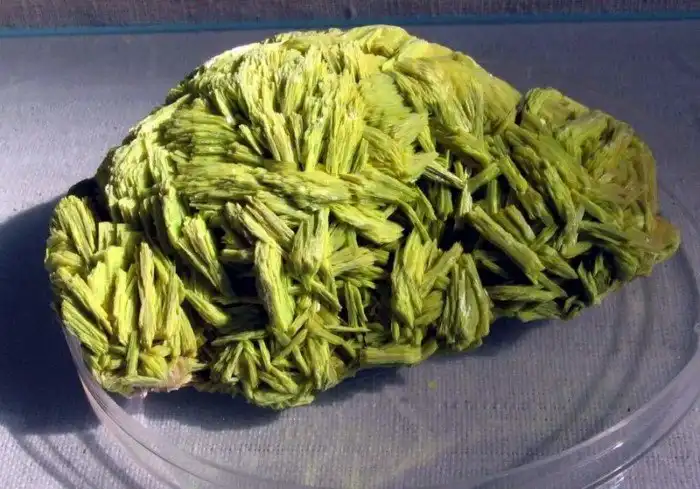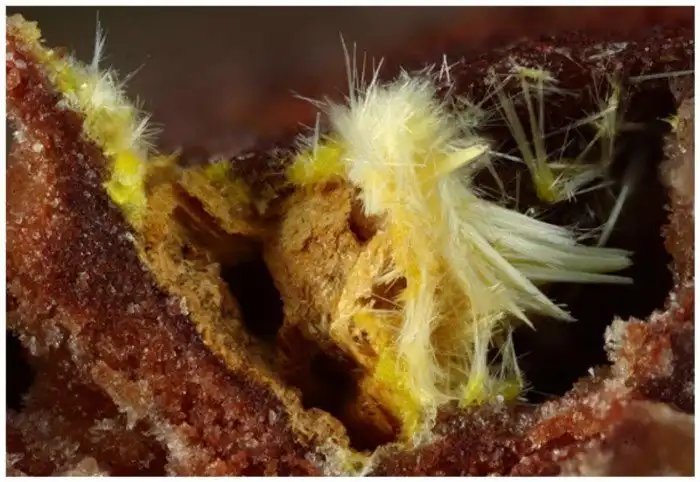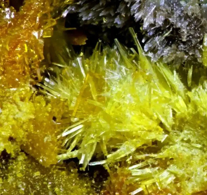 На снимке - уранофан (жёлтые игольчатые кристаллы) и купросклодовскит (зелёный)