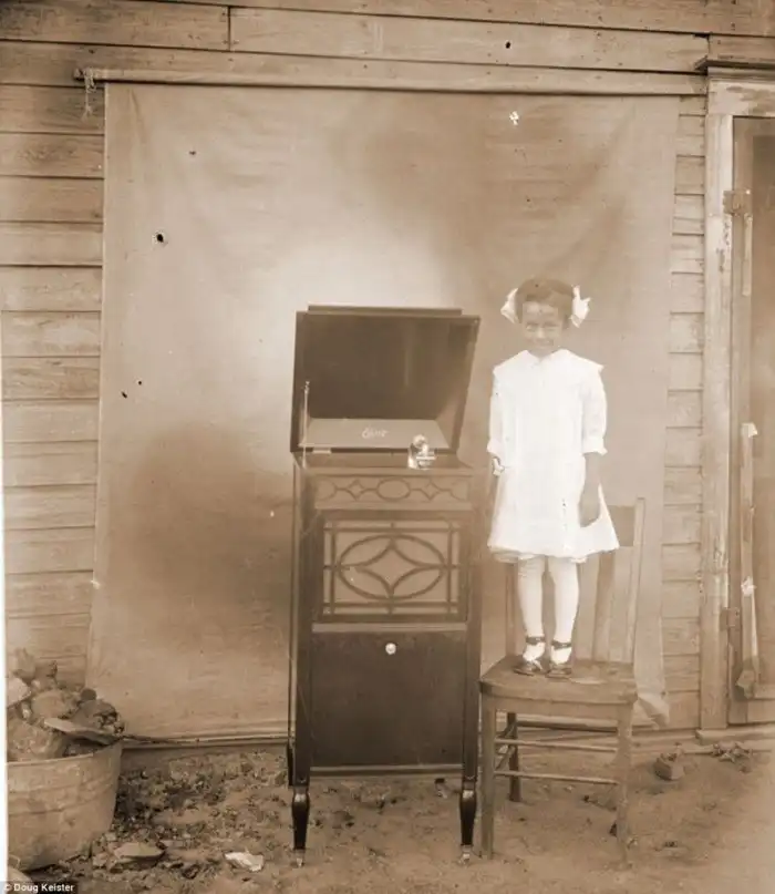 Девочка позирует рядом с фонографом Эдисона