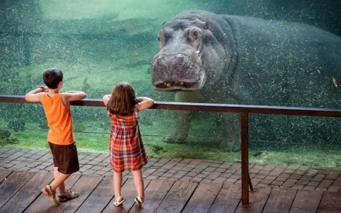 Бегемот устанавливает визуальный контакт с двумя посетителями зоопарка в Испании. Кажется, что бегемот замер, уставившись на детей, во время их посещения Биопарка в Валенсии.