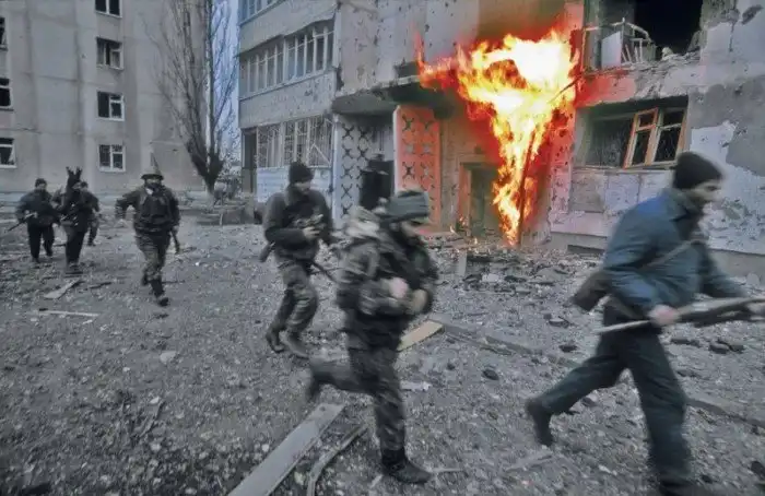 Передвижение боевиков в сторону президентского дворца под огнем артиллерии. Грозный. Чеченская Республика. Январь 1995. Фотография предоставлена Дж. Батлер (Великобритания)