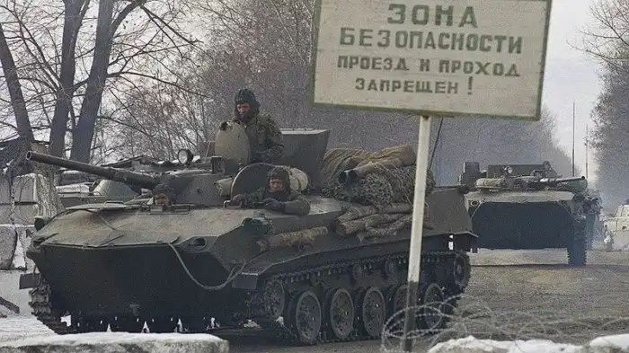 Колонна бронетехники въезжает в Грозный. Чеченская Республика Ичкерия. (Иначе Чеченская республика). РФ. 12 декабря 1994 года.