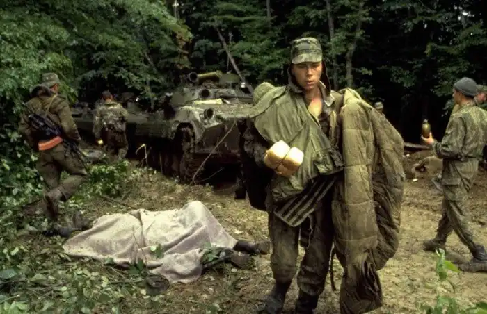 Фотограф В. Вяткин. Гибель Сергея Тимошина, военнослужащего 6-й роты 10-го полка ВДВ РФ. Чеченская Республика. 1 апреля 2000. РИА Новости