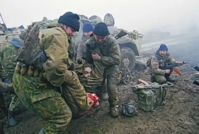 Фотограф Ю. Козырев. Вынос раненого из боя. Район Центороя. Чеченская Республика. 16 декабря 1999. Фотография предоставлена Ю. Козыревым