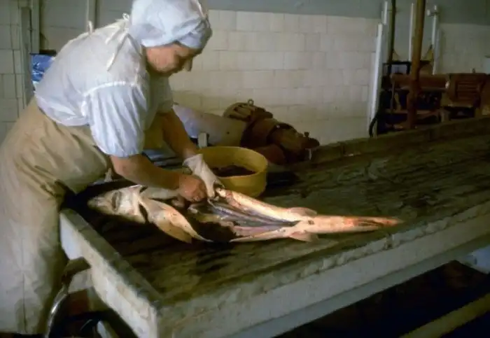 Работница рыбзавода вспарывает брюхо осётра и извлекает икру-сырец. Рыба без икры сразу отправляется в цех копчения, заморозки или консервации, в зависимости от текущих потребностей рынка.