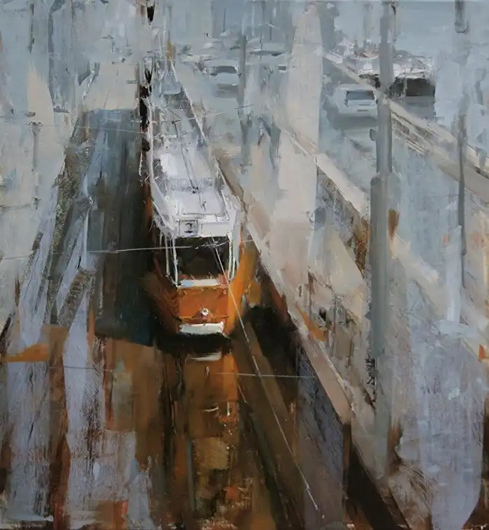 «Первый трамвай» — масло, холст. Олег Рауба (род. 1956).