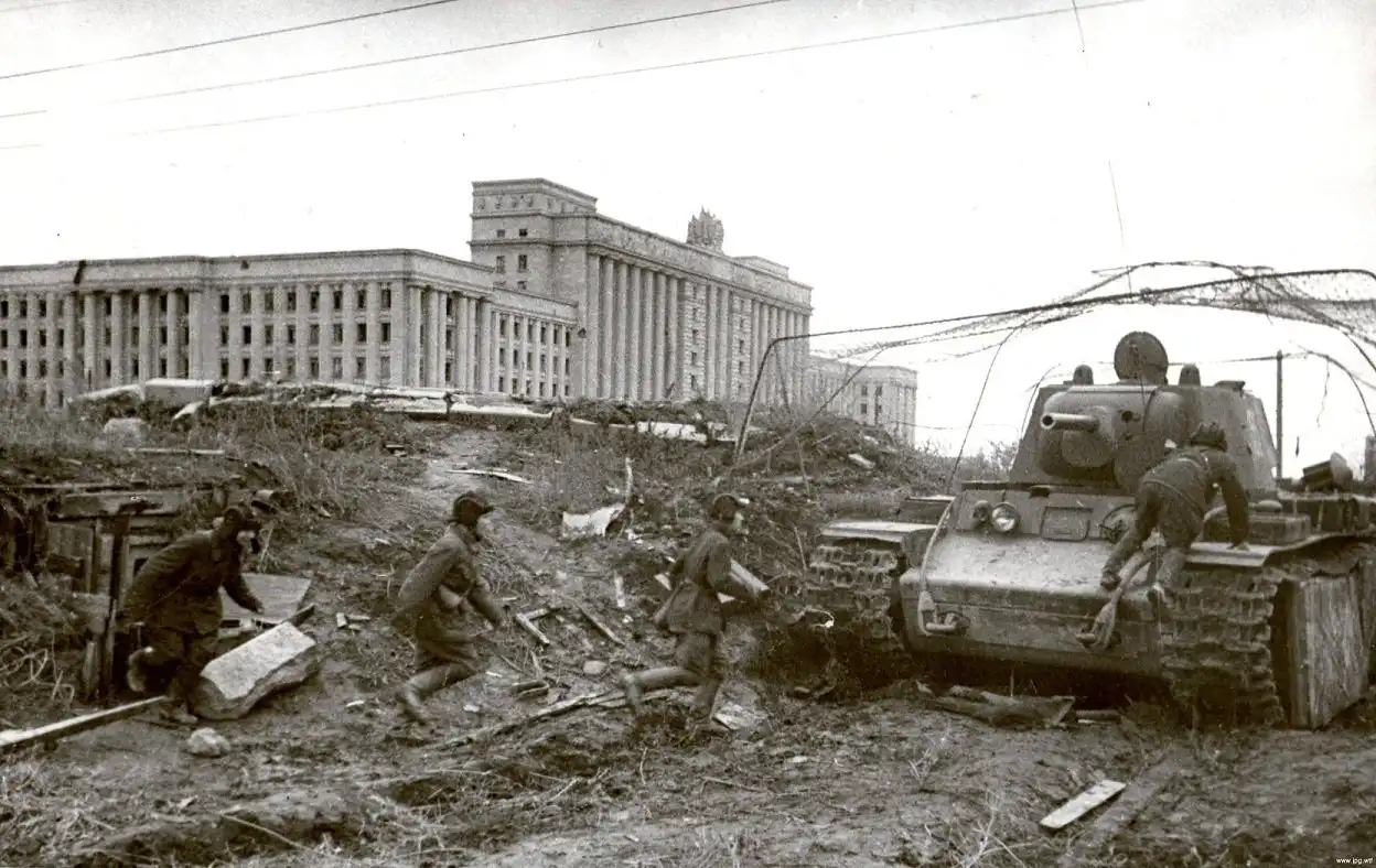 Экипаж бежит к своему КВ–1 на Московском проспекте, 1942 год, Ленинград