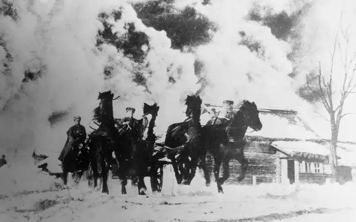 Тачанка и конники 2-го гвардейского кавалерийского корпуса на марше по улице населенного пункта во время контрнаступления советских войск под Москвой. СССР. Январь 1942 года.