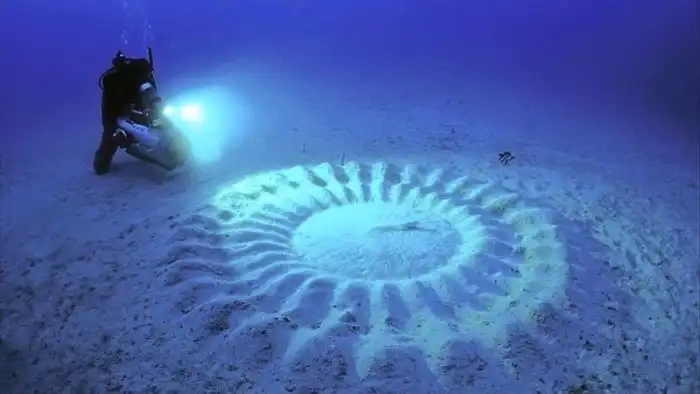 Мистические подводные круги на дне океана на самом деле имеют вполне приземленное предназначение. Узоры на песчаном дне рисуют самцы рыбы фугу для того, чтобы привлечь самок. Иглобрюхие рыбки день и ночь трудятся для создания потрясающих подводных скульптур. Делают они это при помощи всего лишь одного плавника. Самка рыбы фугу выбирает того самца, чьи бороздки на песке глубже, а хребты выше. И не зря, потому что высокие песчаные хребты препятствуют тому, чтобы яйца рыб не унесло течением. Впервые песчаные круги увидел японский фотограф Йоджи Оката, который при помощи камер решил заснять эти удивительные орнаменты и поделится с миром своей находкой.