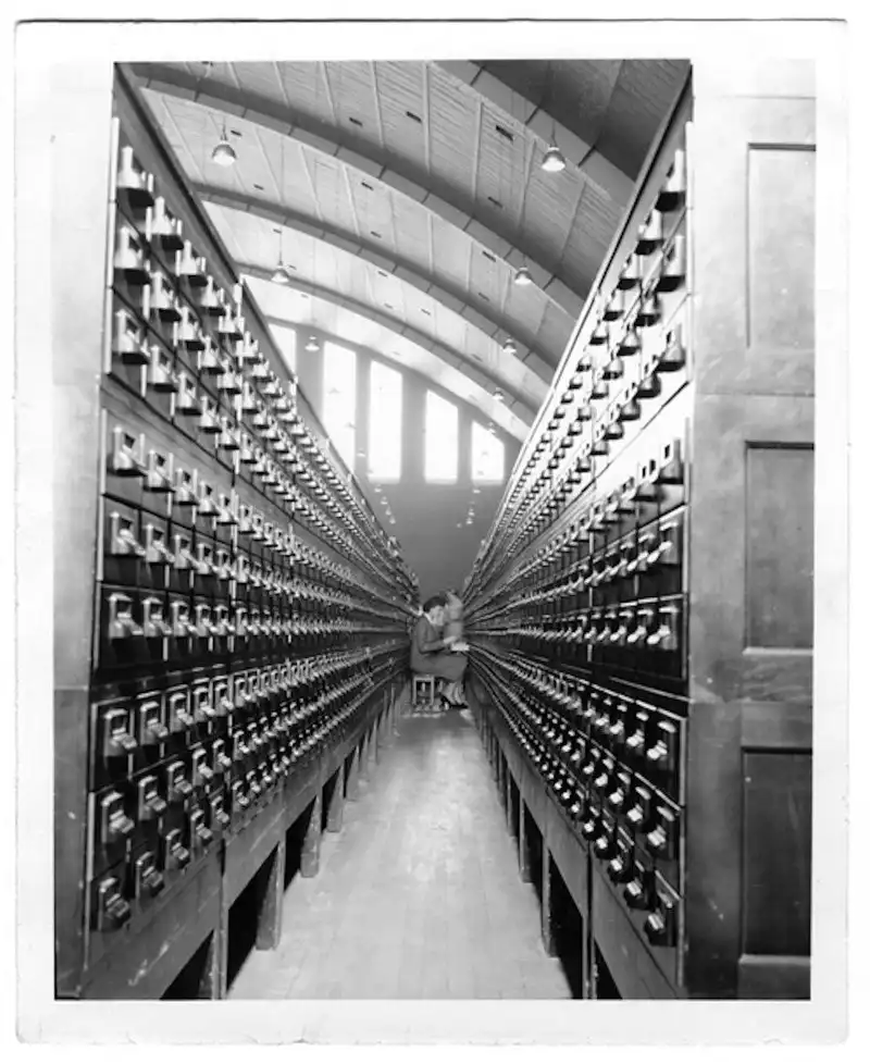 На снимках: Центральная дактилоскопическая библиотека ФБР 40-х годов. Самая крупная на то время да и в последующие годы база отпечатков пальцев в мире, созданная директором Гувером. Колоссальный архив, в котором работало 20000 человек, содержал в 1943 году порядка 70 млн. карточек. Он неуклонно рос, и к 1956 году эта картотека насчитывала уже 141 231 713 записей.