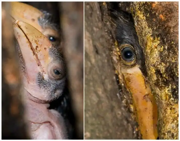 Гнезда птиц-носорогов интересны тем, что самка, отложив яйца, замуровывает себя изнутри, высиживает яйца и растит птенцов, а самец кормит семью через узкую щель.