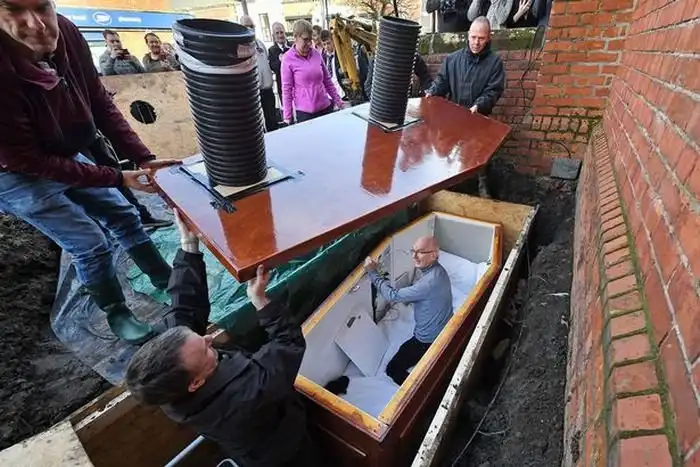 Основатель благотворительного фонда Walking Free Джон Эдвардс из Белфаста, Северная Ирландия, решил весьма необычным образом помочь всем тем, кто страдает от наркотической или алкогольной зависимости, пребывает в депрессии и находится на грани самоубийства. В течение трех дней Джон будет поддерживать и подбадривать всех желающих, находясь в гробу, который закопан в землю близ церкви Уиллоуфилд Черч. Проект стартовал вчера, 1 марта, внутри гроба есть электричество и интернет, посредством которого Джон общается с людьми. Сам он говорит, что понаслышке знает о проблемах зависимых людей, так как сам в прошлом был наркоманом.