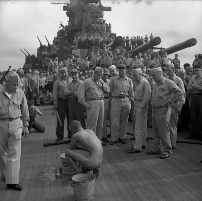Экипаж корабля США Нью-Джерси (BB-62) смотрит, как японский военнопленный бреется и моется.