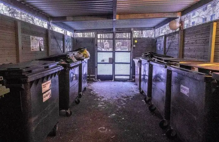 Мусоропровода в доме нет. Свои отходы жители района выносят на улицу, в специальный контейнер. Он всего один на район. Мусорные баки огорожены забором и стоят под крышей. Чтобы ветер не разметал, и чтобы животные не лазали по помойке и не раскидывали мусор.