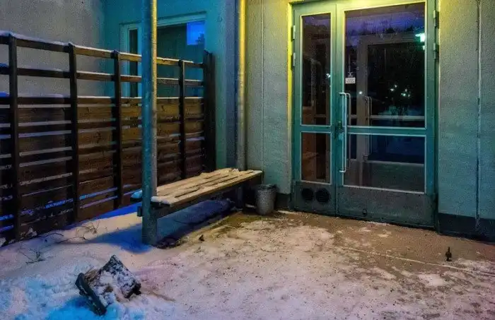 У подъезда лавочка, мусорное ведро и непременная щётка, чтобы чистить обувь зимой. И стеклянные двери. Никаких домофонов, у каждого жителя есть ключ. При этом, двери запирают только после девяти вечером, днём вход свободный.