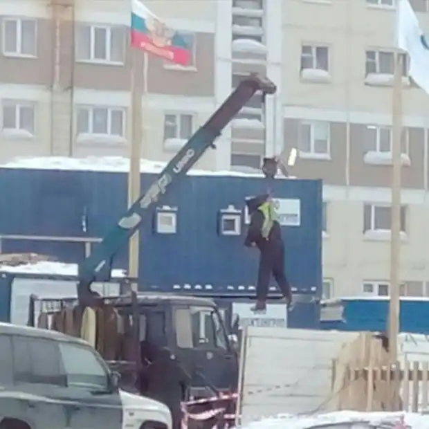 Не найдя большой лестницы или автовышки, в Норильске решили водрузить флаг с помощью автокрана. Рабочего подняли на нужную высоту, пристегнув крюком за шкирку, после чего он благополучно повесил флаг. Явно, что ни о какой технике безопасности в этот момент не думали, и руководствовались принципом «если надо - значит надо».