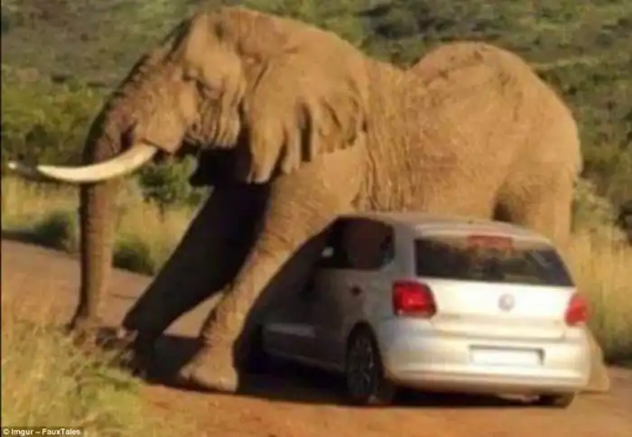 Снимок сделан в южноафриканском национальном парке Пиланесбург. Слону захотелось обо что-то почесаться и он выбрал для этой цели машину