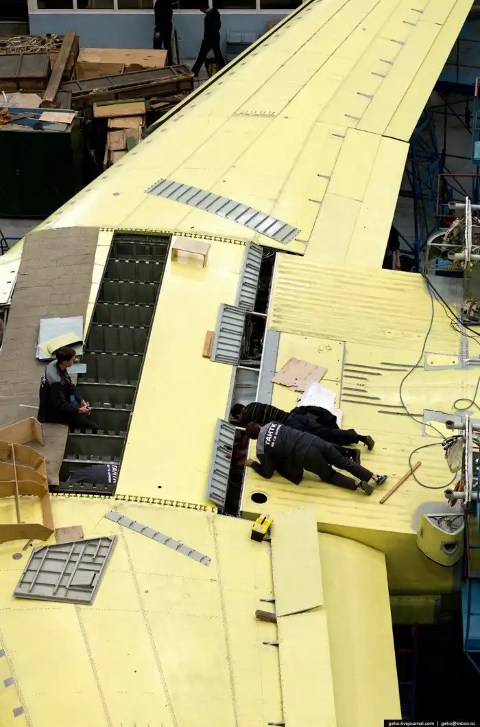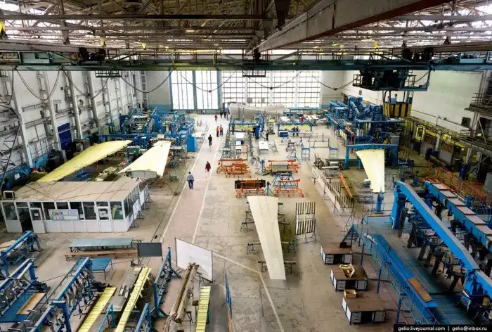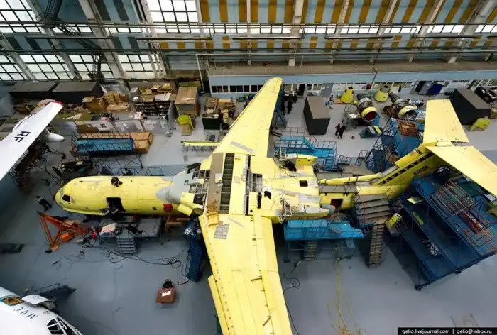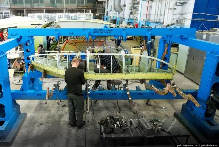 Сборка элементов механизации крыла самолёта-амфибии. Размах крыла Бе-200ЧС — около 33 метров, максимальная взлётная масса — 42 тонны.