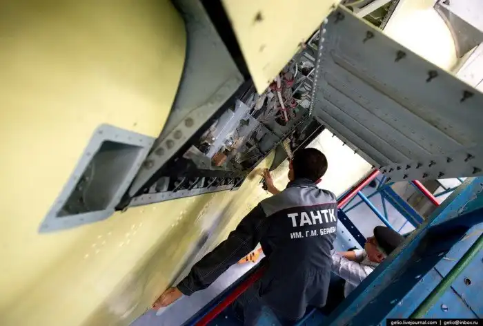 Работы на центроплане крыла. Бе-200 спроектирован по схеме «высокоплан» со стреловидным крылом, расположенным над фюзеляжем.