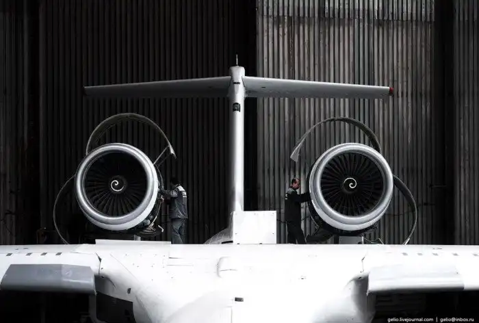 Капоты мотогондол открыты. Ведётся настройка агрегатов силовой установки. Бе-200ЧС оснащается двумя турбореактивными двухконтурными двигателями Д-436ТП (производство — «Мотор Сич», Украина) взлётной тягой 7650 кг каждый.