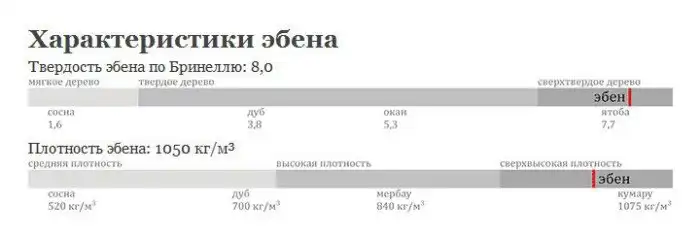 *Жилистый эбен — коромандельское (каламандерское), из Новой Зеландии, а также схожий с ним камагукский и филиппинский эбен.