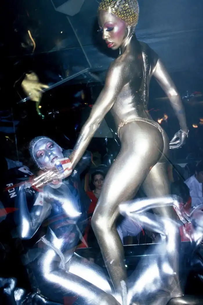 3. Раскрашенные металлической краской танцоры выступают на сцене дискотеки в Нью-Йорке, 1978 год