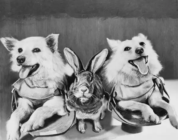 Собаки Отважная, Снежинка и кролик перед полетом на геофизической ракете. Советский Союз, 1958 год