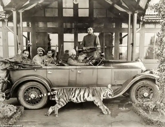 Британские офицеры с индийскими проводниками после удачной охоты на тигра.