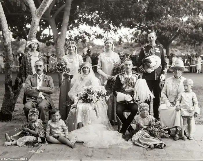 Свадьба в высшем обществе. Бракосочетание Сисли Уинфред Гошен, дочери губернатора Мадраса виконта Джорджа Гошена, и майора Эдварда Бертрама Портала состоялась в ноябре 1926 года. Молодожены в центре снимка, вокруг - ближайшие родственники и друзья.