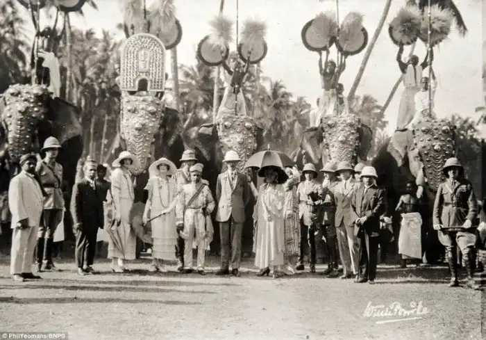 Фото на фоне церемониальных слонов во время очередного парада: губернатор с супругой, высшие офицеры и местная знать.