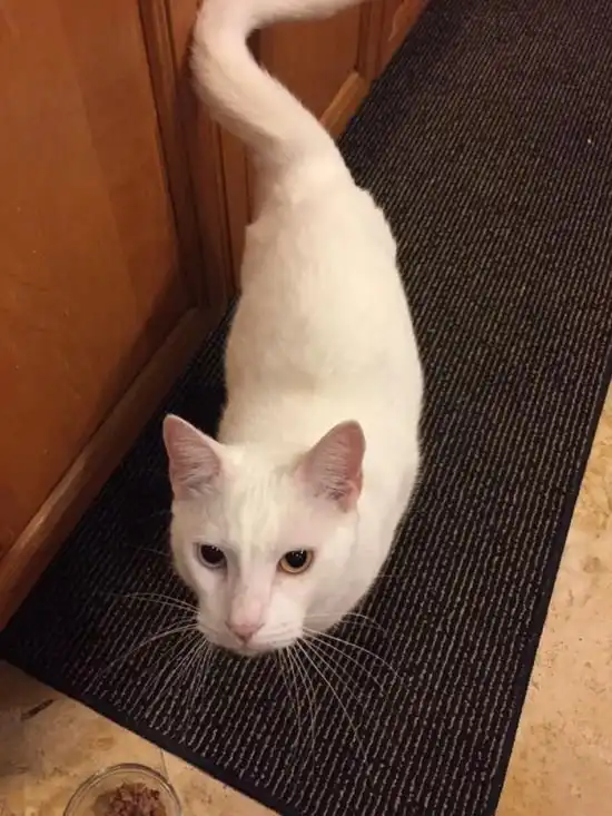 Этого несчастного бездомного кота, страдающего от чесотки и истощения, нашли на улицах Ройал Палм Бич во Флориде, США. Состояние животного было ужасным, к тому же из-за болезни бедолага не мог открыть глаза. Когда о животном написал один из пользователей сети, за ним приехали сотрудники центра Animal Friends Rescue Project. В приюте животное осмотрели ветеринары, которые прописали ему курс лечения. Вскоре кот пошел на поправку и удивил всех не только красотой своей белоснежной шерсти, но и невероятно красивыми разноцветными глазами.
