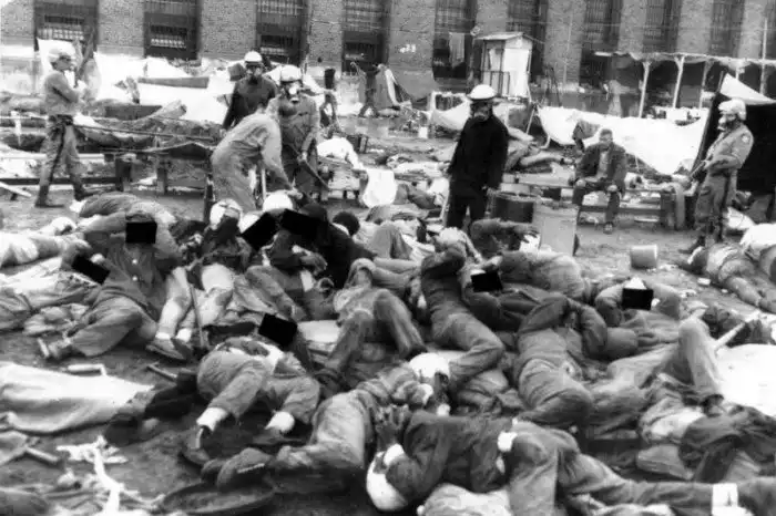 Фото сделано в 1977 году в тюрьме "Аттика" в Нью-Йорке, где 2000 заключенных подняли бунт против трех десятков тюремных служащих. Бунт чудом удалось подавить, ни один преступник не сбежал.