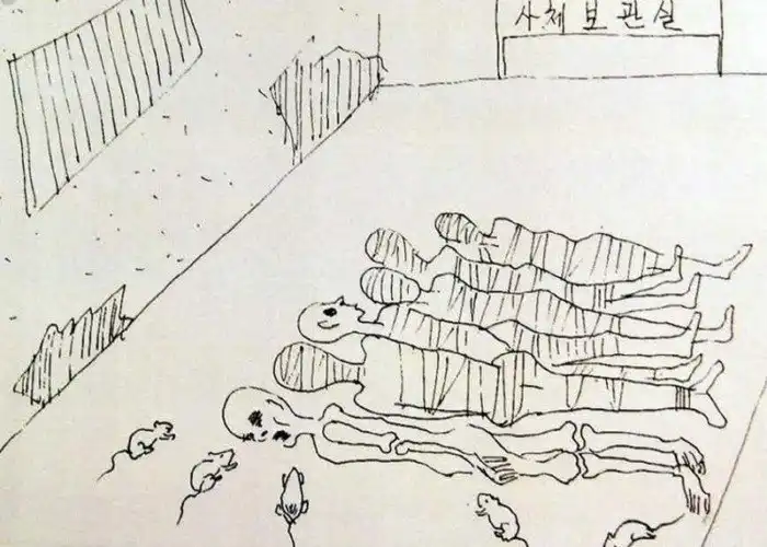 Пока в мир не проникло ни одной фотографии из северокорейских тюрем. Этот рисунок - одно из немногих свидетельств о них: его нарисовал бывший заключенный северокорейской тюрьмы, впоследствии выпущенный на свободу и бежавший на Запад.