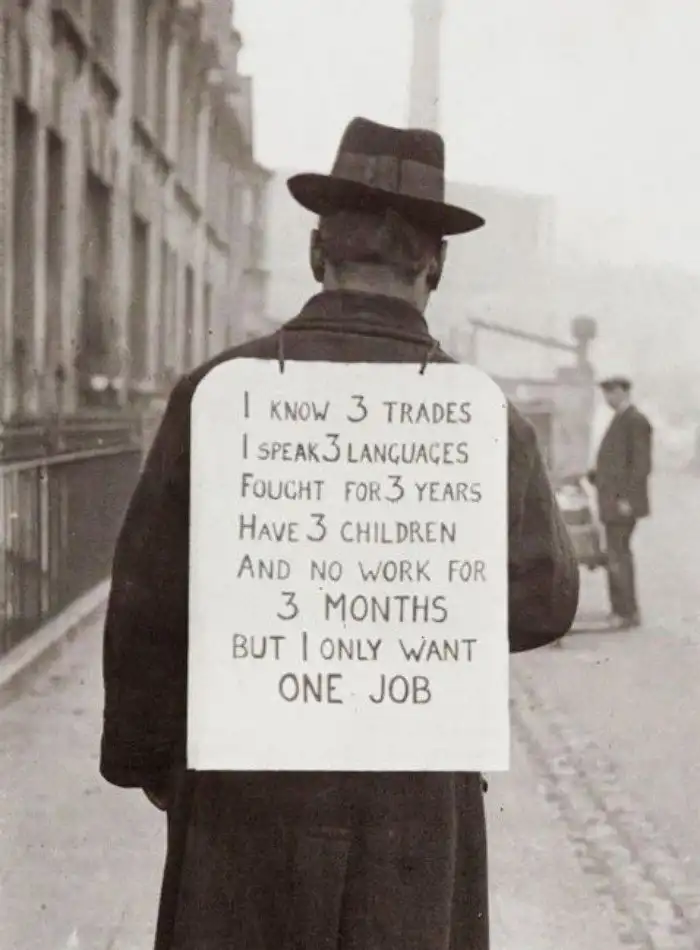 (“У меня три профессии, я говорю на трех языках, сражался три года, у меня трое детей и я безработный уже три месяца, но я ищу всего ОДНУ работу”)