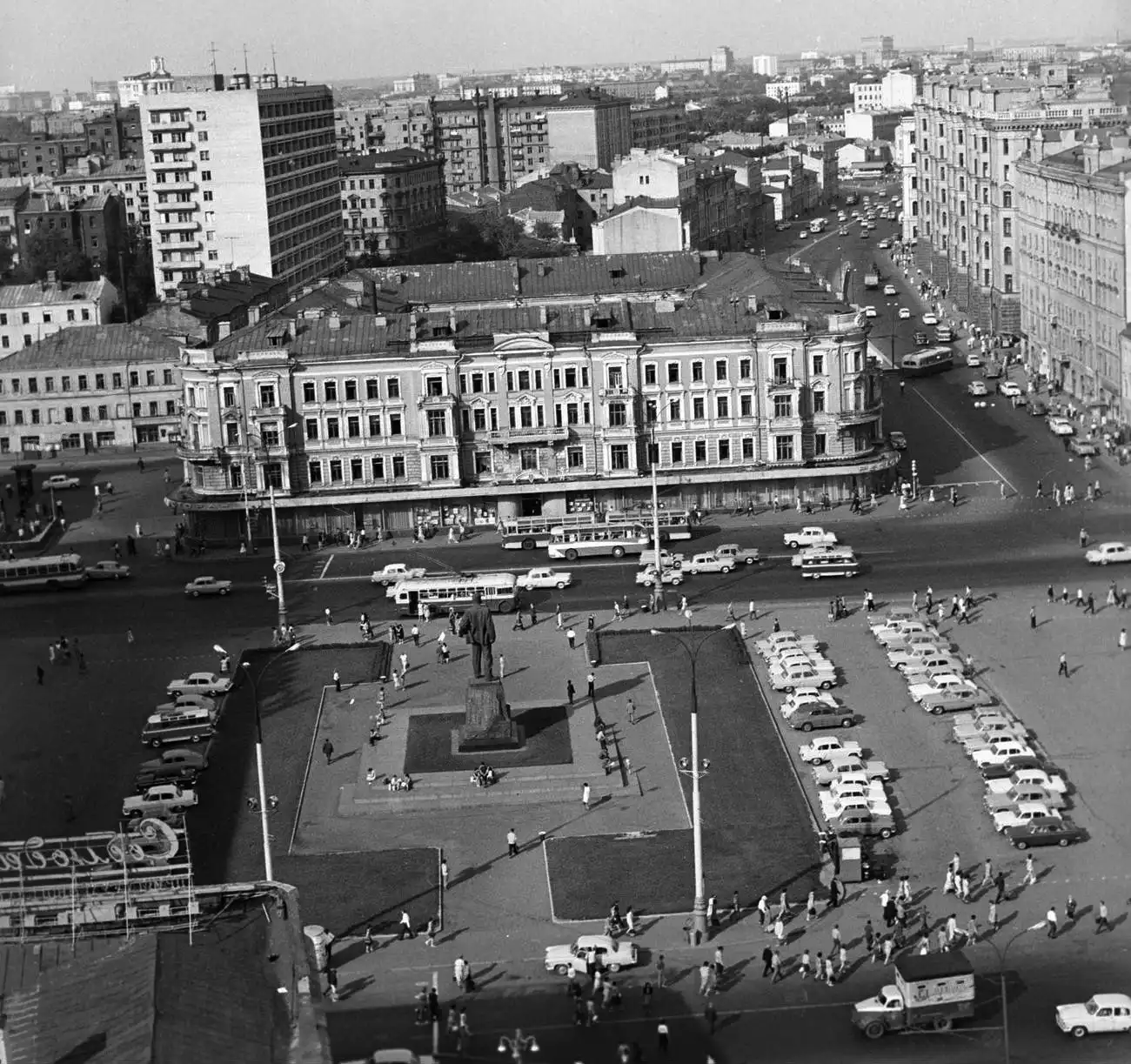 Фото 1966 г. Площадь Маяковского. Дом, в котором располагался театр "Современник" ещё стоит (в левом нижнем углу). Цел ещё Оружейный переулок. И в целом детали любопытные, люди, машины, переходы, фонари...
