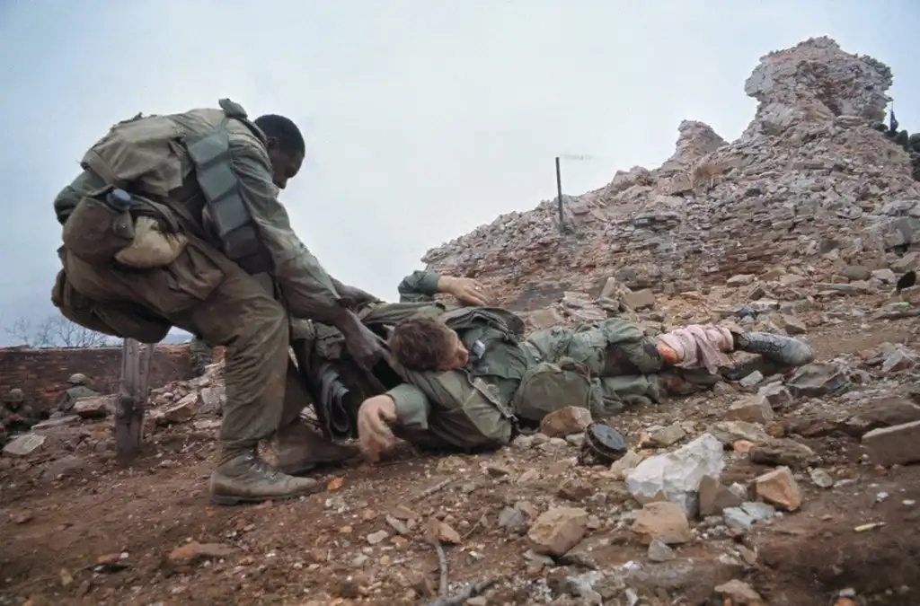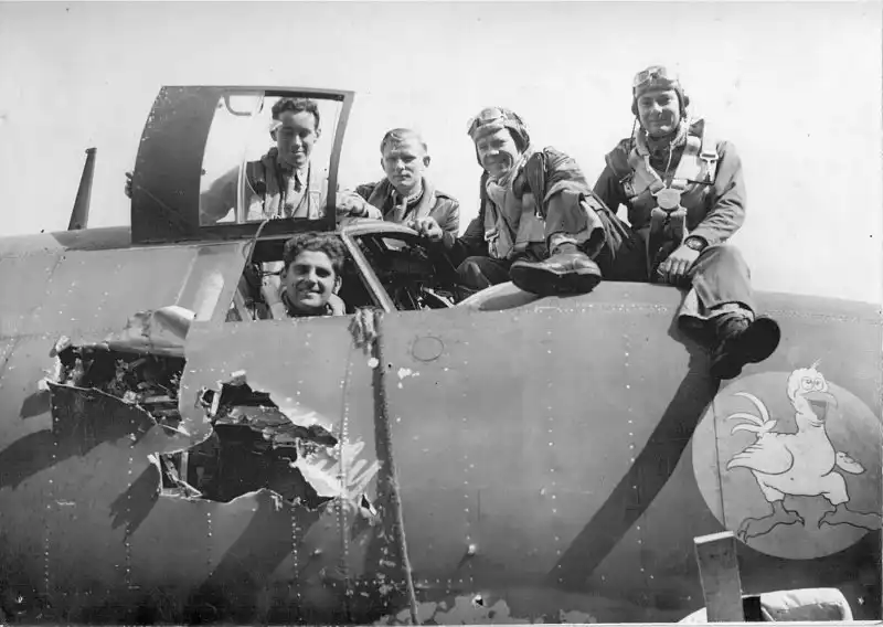 Бомбардировщик из 323-й бомбардировочной группы ВВС США (323rd bomb group) был поврежден зенитным огнем во время боевого вылета над французской коммуной Мервиль (Merville). Разрывом снаряда у самолета снесло носовое остекление и осколками пробило фюзеляж в районе места второго пилота, которого спас противоосколочный жилет. Все летчики остались живы. Члены экипажа слева направо: штурман — лейтенант Том Трейнор (Tom Trainor), второй пилот — лейтенант Джим Дэвис (Jim Davis), бортинженер — стаф-сержант Ричард Кинг (Richard King), стрелок-радист — стаф-сержант Джозеф Уайт (Joseph S. White).