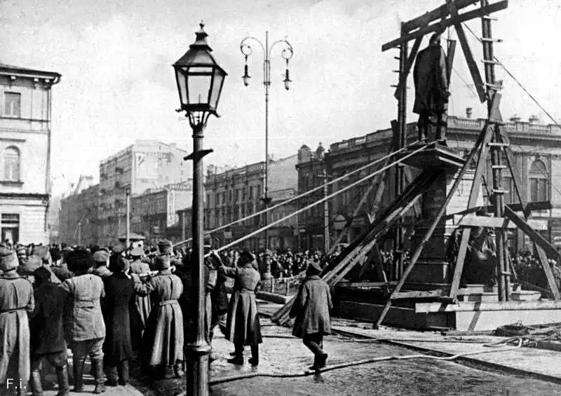 Революционеры сбрасывают с пьедестала памятник П.А. Столыпину. Киев, 1917 год.