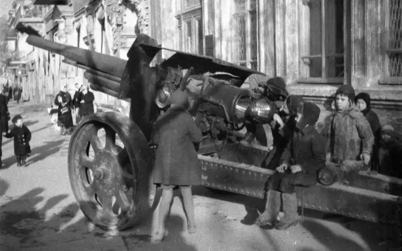 Дети играют с брошенным орудием на пр. Нахимова, в освобожденном Севастополе. В кадре редко встречающееся орудие 10.5 cm Cannon Model 1927 шведского концерна Bofors. Орудия данной модели, двумя партиями в количестве 52 единиц, были закуплены для голландской армии. Большинство из этих орудий были захвачены вермахтом, который использовал их под обозначением 10,5 см FK 334 (h) / FK 335 (h). Имеются сведения о передаче вермахтом 2-х батарей данных орудий румынской армии.