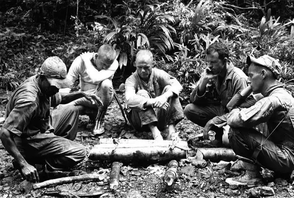 1963. Астронавты Нил Армстронг, Джон Гленн, Гордон Купер и Пит Конрад на занятиях по выживанию в тропиках. Базе ВВС Олбрук рядом с Панамским каналом
