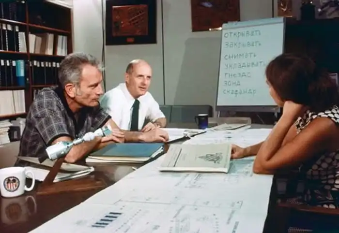 Астронавты Дональд Слейтон и Томас Стаффорд, участники программы «Союз–Аполлон», на занятиях по русскому языку с преподавательницей Ниной Хорнер, Космический центр имени Линдона Джонсона