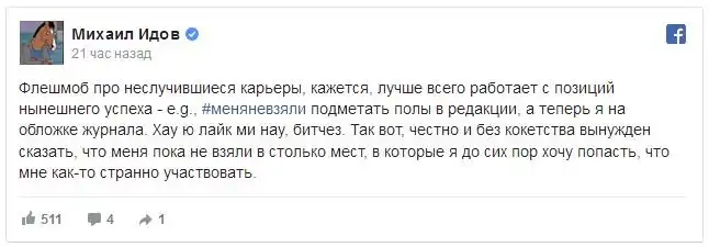 В русскоязычном сегменте социальной сети Facebook набирает популярность флешмоб #МеняНеВзяли. В рамках данного флешмоба люди делятся историями о том, как их не взяли на какую-либо работу. К простым пользователям сети присоединились и известные личности, решившие рассказать о своих неудачных опытах в поиске работы. Давайте и мы поделимся друг с другом своими историями, когда мы слышали отказы при попытке устроиться на работу.