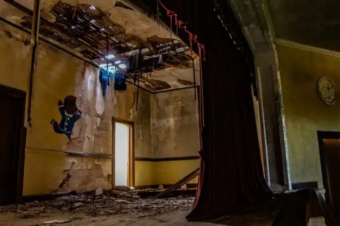 Потолок практически обвалился, однако изображение резвящегося чернокожего мальчика на стене сохранилось почти полностью.