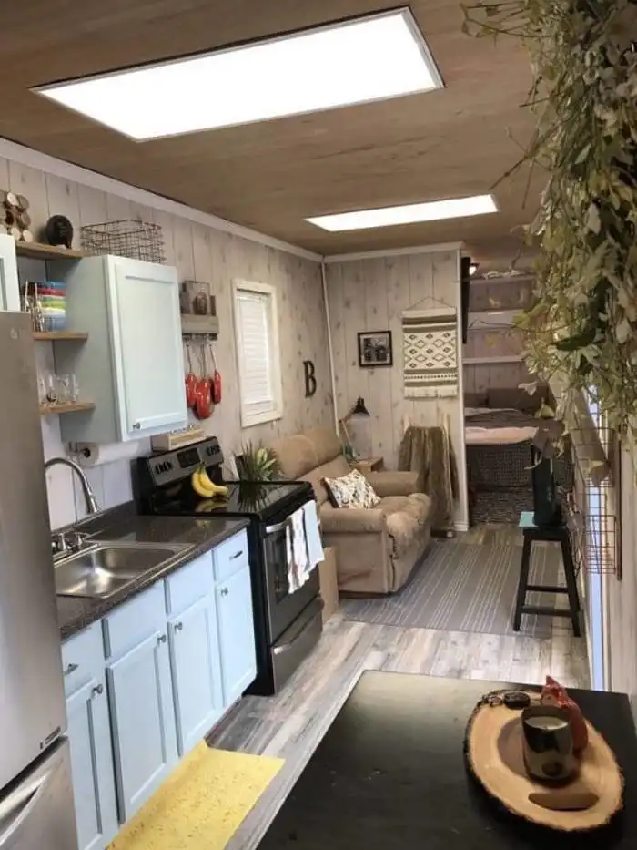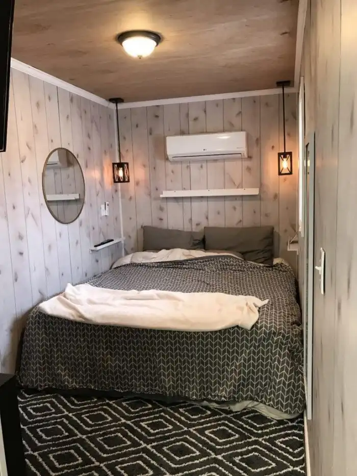 Контейнер идеально вмещает в себя полноразмерную спальню, удобную гостиную и прекрасную кухню.